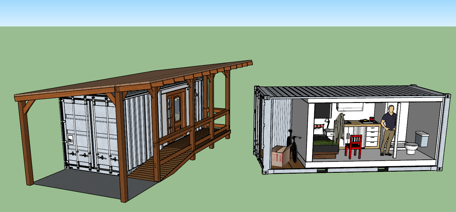 Seven seacans converted to tiny houses and arranged as a village on a city lot. The ownership concept is for displaced veterans to use their support payments to secure micro-mortgages for the small houses and to start building up independent equity. The units are super insulated passive house models with solar assisted energy and barrier-free access. A buy-back clause to Green Violin ensures sustainable housing in perpetuity. We are working with local Structural Insulated Panel (SIP) manufacturers and NAIT on micro-suite features.